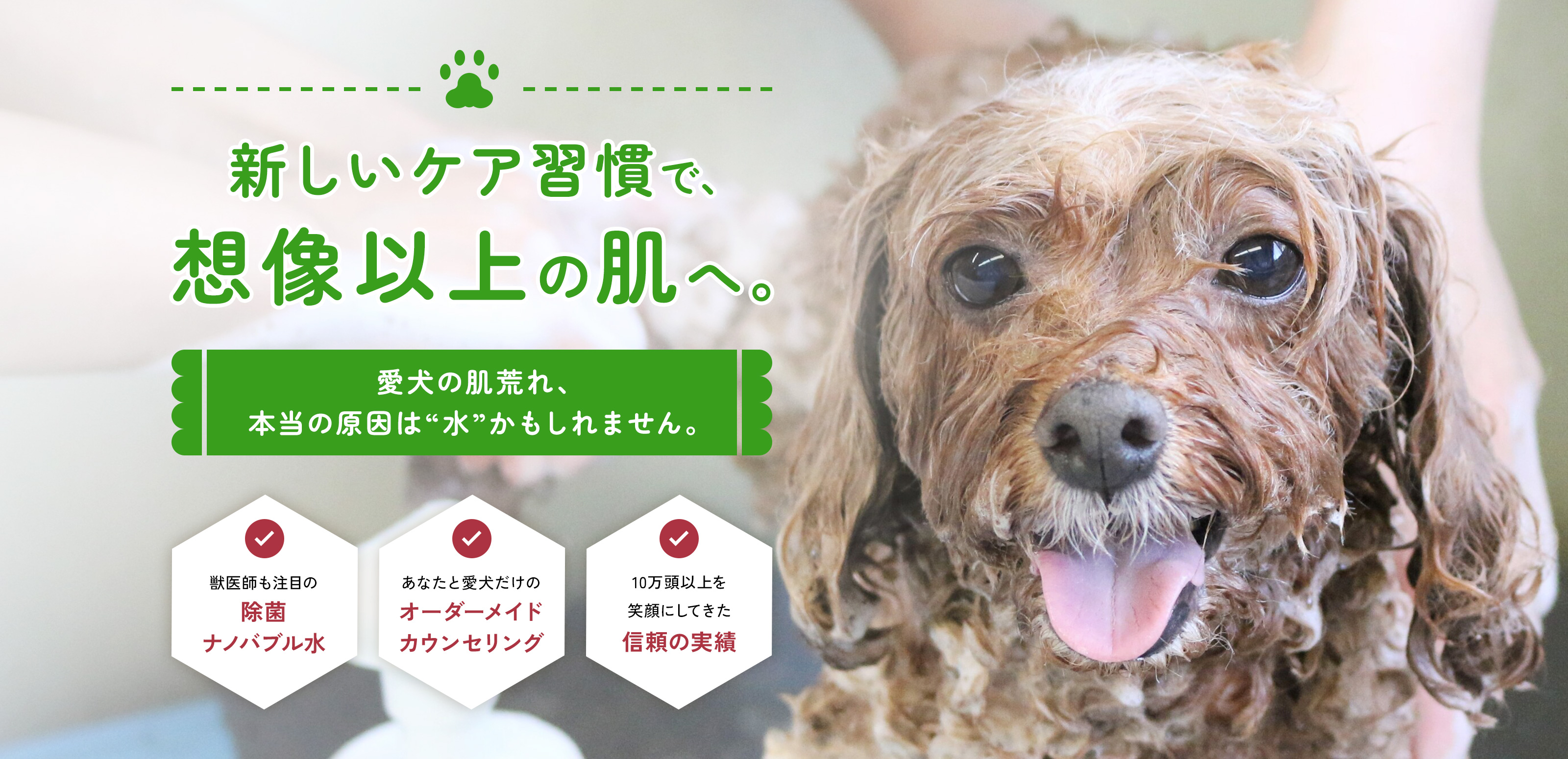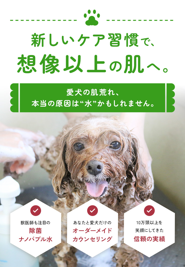 当サロンが使用するシャンプーマシンから出るのは、目に見えないほど小さな泡「ナノバブル」を含んだ特別な水です。ナノバブルは毛穴の奥まで入り込み、汚れや菌を優しく浮かせて洗い流します。ゴシゴシとこする必要がないため、デリケートな肌のワンちゃんでも安心。このこだわりの水は、当サロンの全店舗で使用しています。
