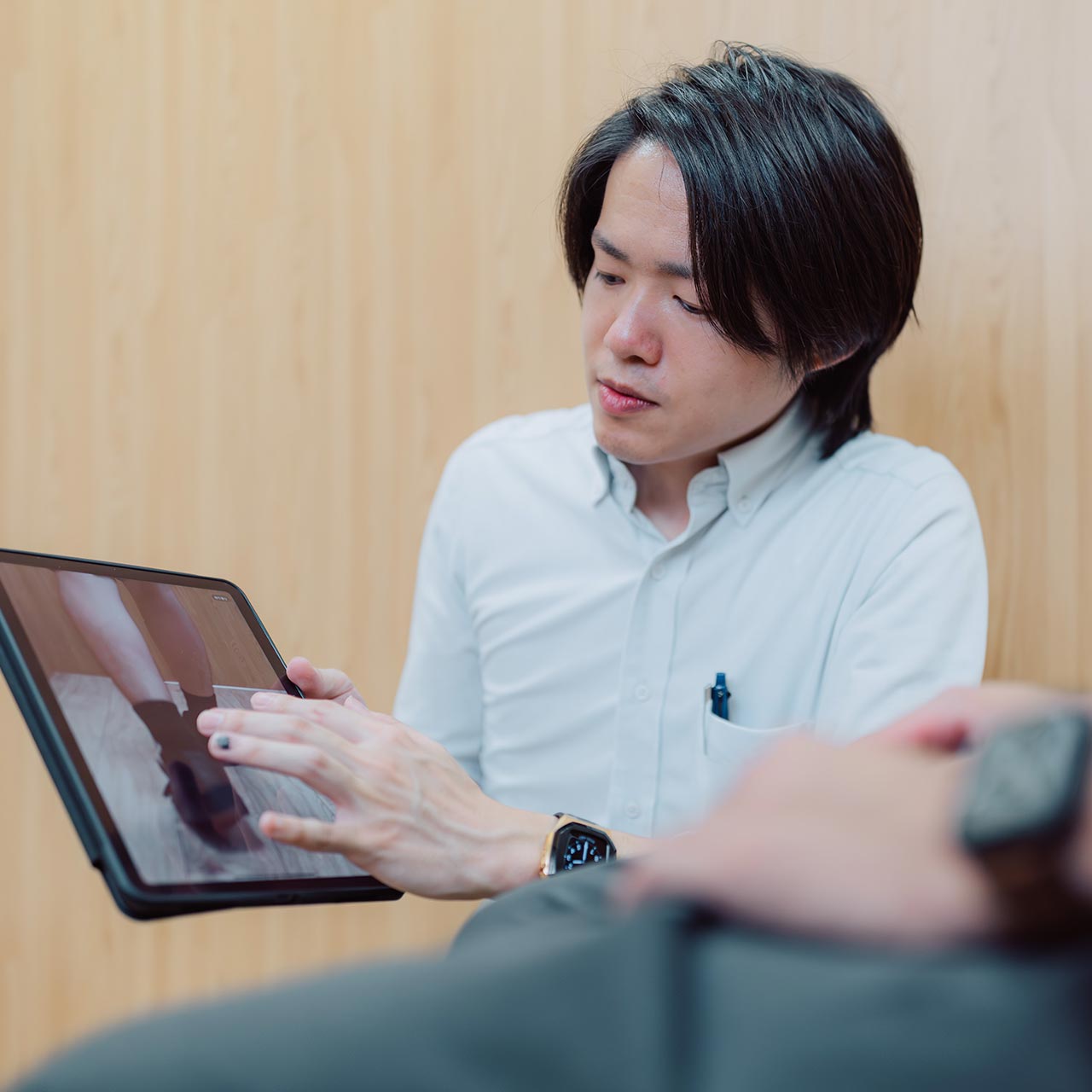 国家資格を持つ義肢装具士が、現在のお困りの状態や悩みをじっくりと伺います。いつから気になっているのか、どんなときに困るのか、そして本当はどんな自分になりたいのか。あなたの「声」を何よりも大切にしたいと考えています。そのうえで、足の状態はもちろん、立ち方や歩き方のくせ、さらには身体全体のバランスまで、専門家の視点から細かくチェックしていきます。そうすることで、お客様一人ひとりに合ったサポート方法を考えることができます。