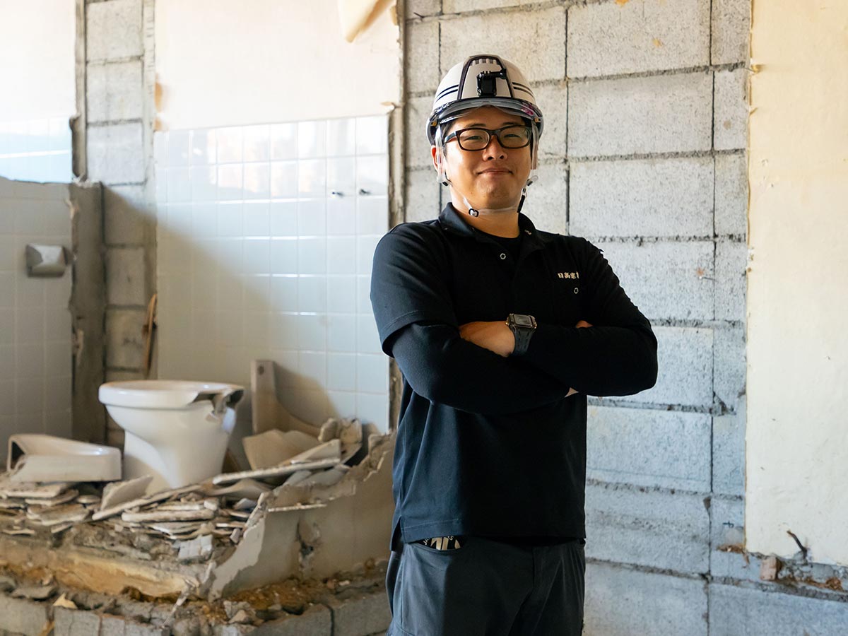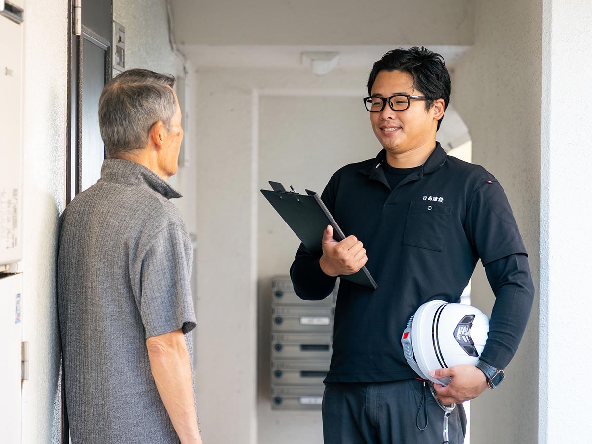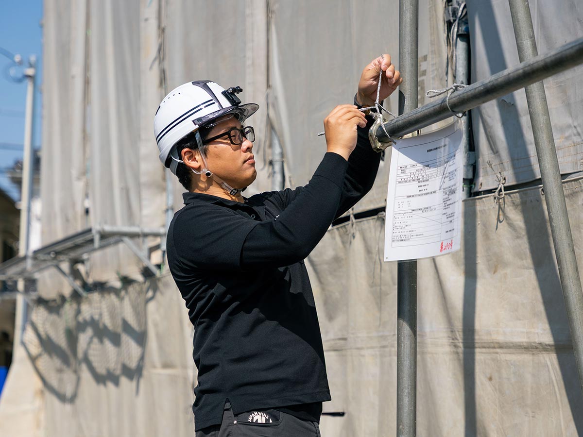 お客様、そして近隣住民の方々との信頼関係を大切にします。着工前には代表がご挨拶に伺い、工事概要を丁寧にご説明。工事中は防音・防塵シートや散水を徹底し、ご迷惑を最小限に抑えます。お客様へは定期的に進捗を報告し、スムーズなコミュニケーションを常に追求。最後まで安心してお任せいただける関係を築くこと。それが私たちの務めです。
