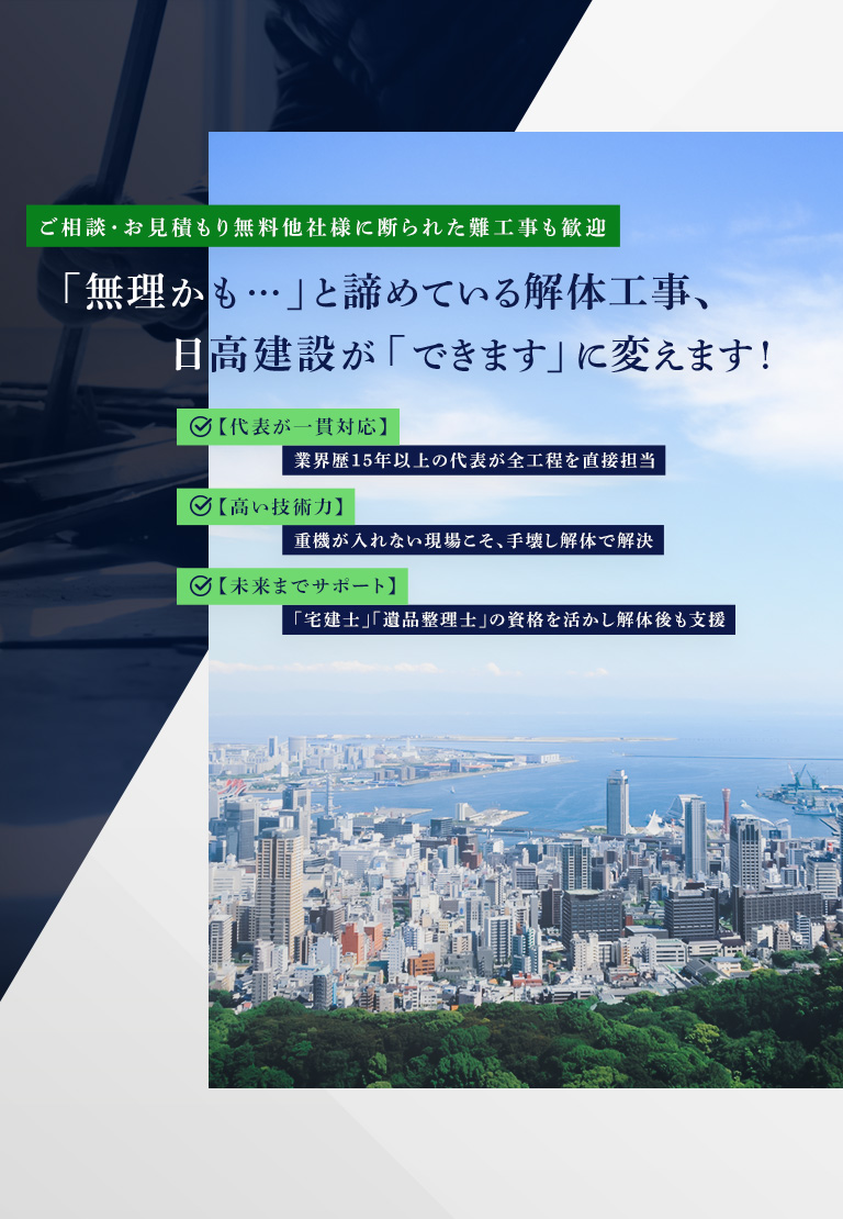 他社様が敬遠するような難しい現場こそ、私たちの技術と経験が活きる場所です。お客様が抱える一つひとつの不安に真摯に向き合い、専門家としての知識と技術、そして何より代表である私個人の責任をもって、ご期待以上のサービスを提供します。ただ建物を壊すのではありません。お客様の不安を「安心」に変え、大切なご実家から、未来への新たな一歩を創り出すこと。それが、私たち日高建設の仕事です。