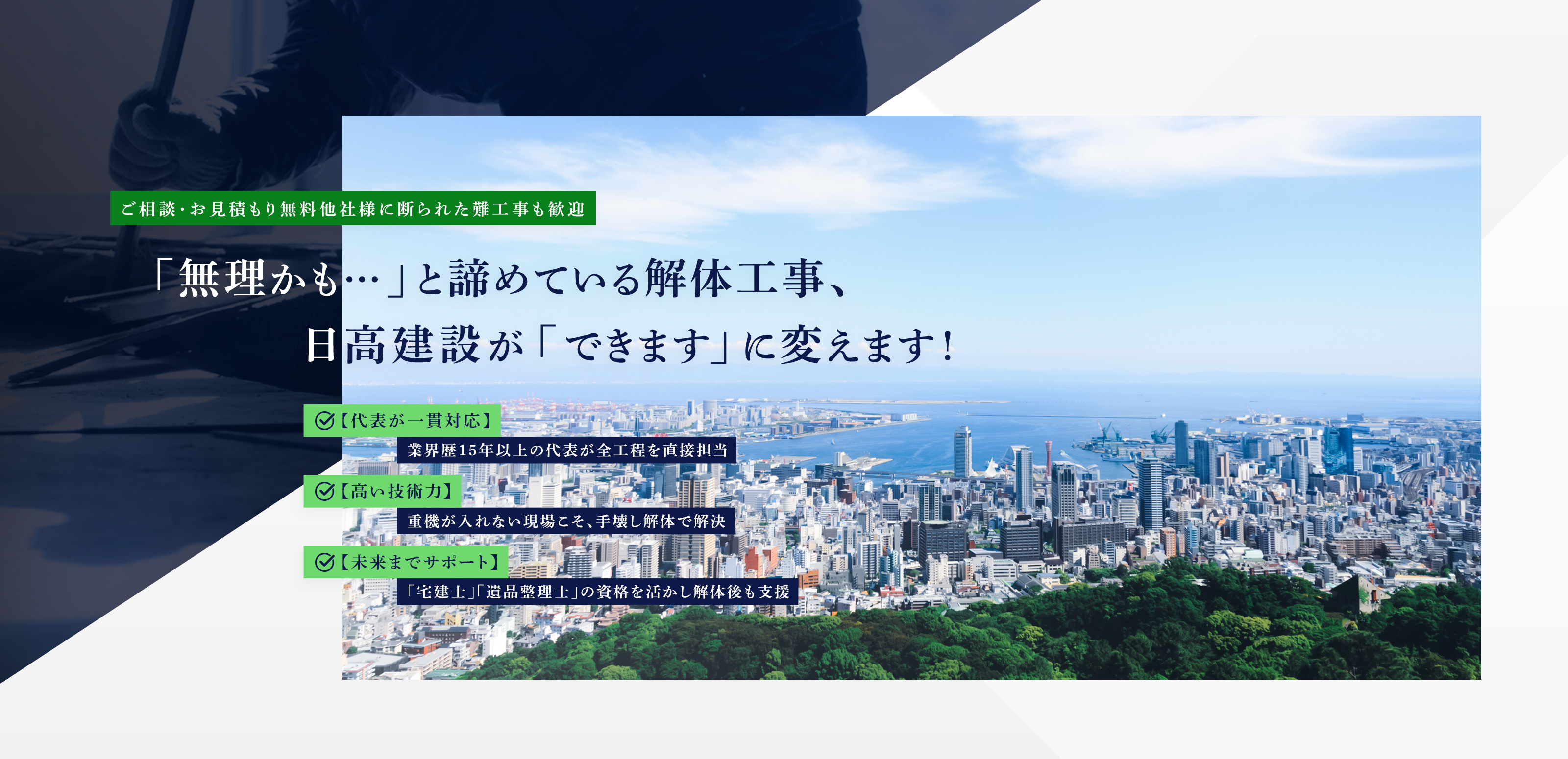 サイトをご覧いただきありがとうございます。代表の日高と申します。ご相談から現地の調査、現場の管理、そしてお引き渡しまで、すべて代表である私が責任を持って対応することをお約束します。「住宅密集地で道が狭いと、他社に断られてしまった」「見積もりの内容が不透明で、どこに頼めばいいかわからない」そんなお悩み・不安も含めて、遠慮なく私にお話しください。