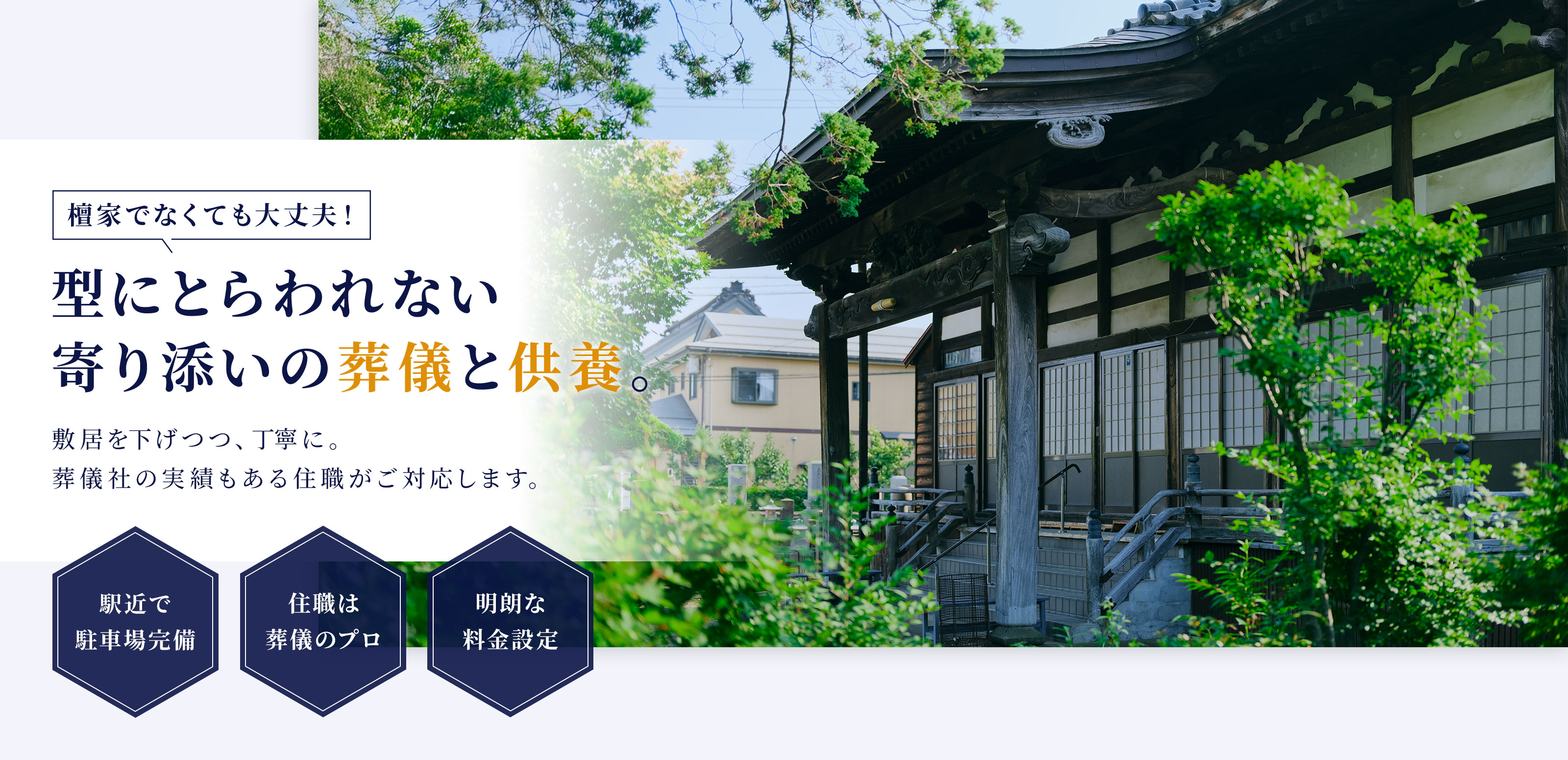 通夜では静かに故人様を偲び、葬儀・告別式では厳かに最後のお別れを行います。もちろん檀家以外の方も同じように丁寧にサポート。元葬儀屋の住職が仏教の作法と実務の両面から、心のこもったお見送りをお手伝いします。
