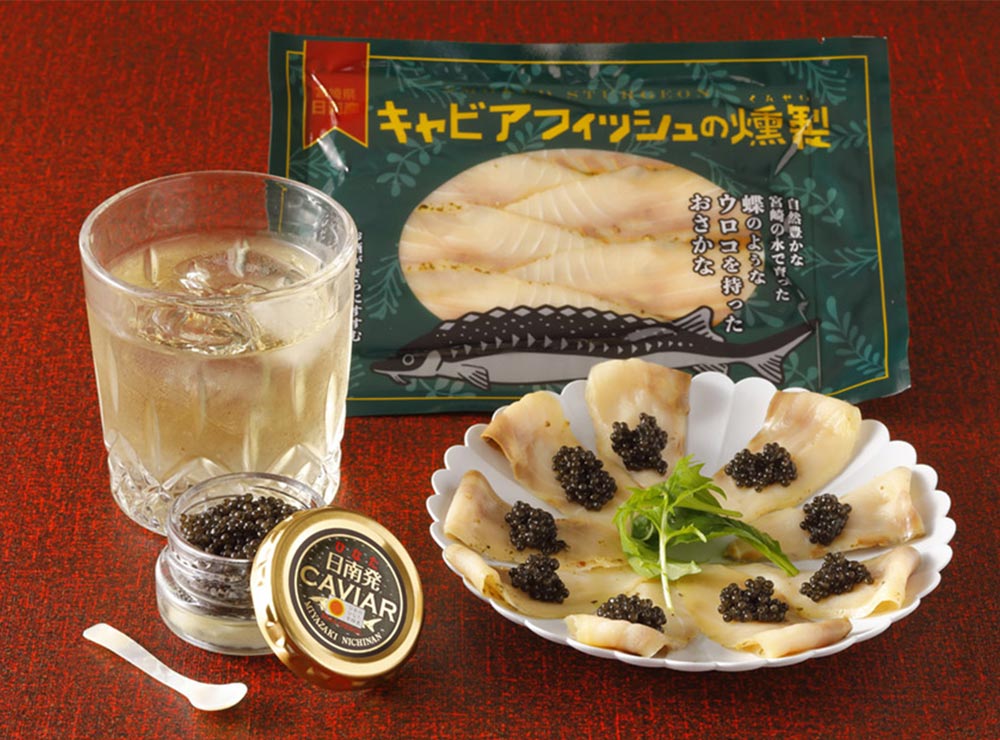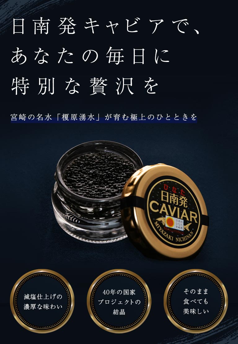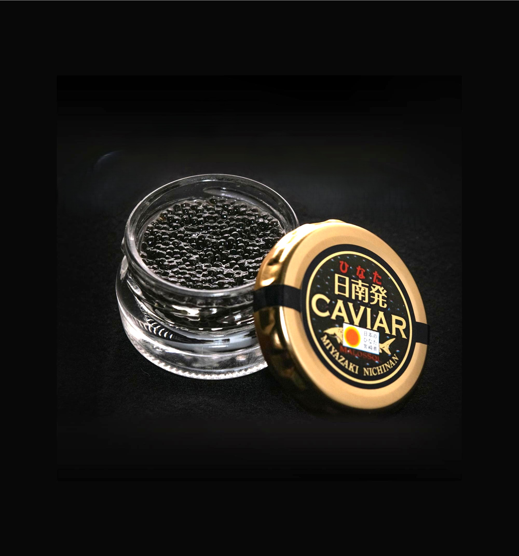 「日南発(ひなた)キャビア」は宮崎の豊かな自然の中、名水「榎原湧水」を使って長い年月をかけて大切に育てられたチョウザメの卵から造った国産キャビアです。減塩仕上げでキャビア本来の濃厚な味わいが楽しめます。当蔵の本格焼酎との相性も抜群です。