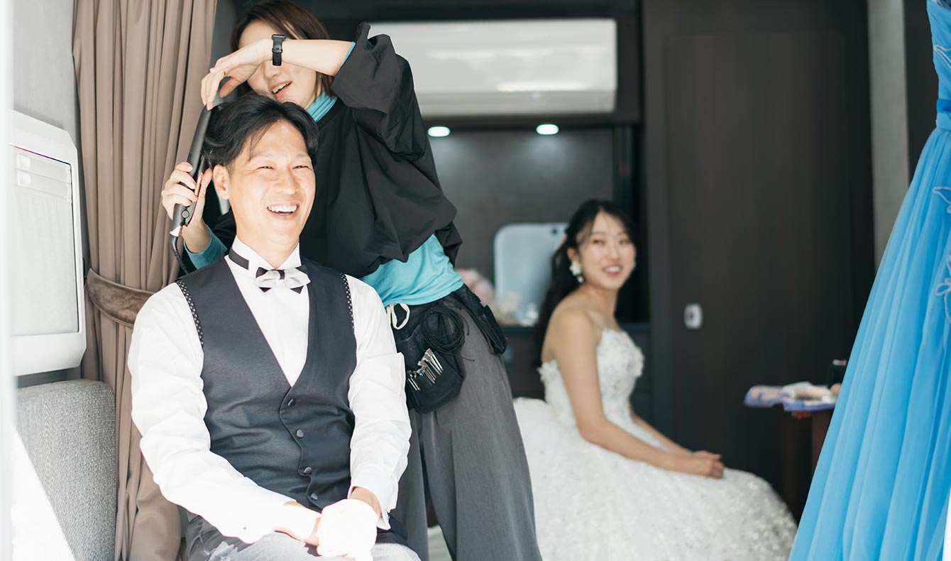フィッティングトレーラーの中では、人目を気にせず落ち着いて準備できます。撮影の合間はソファでリラックス。当社独自のこの形態で、おふたりの素敵な表情を引き出します。