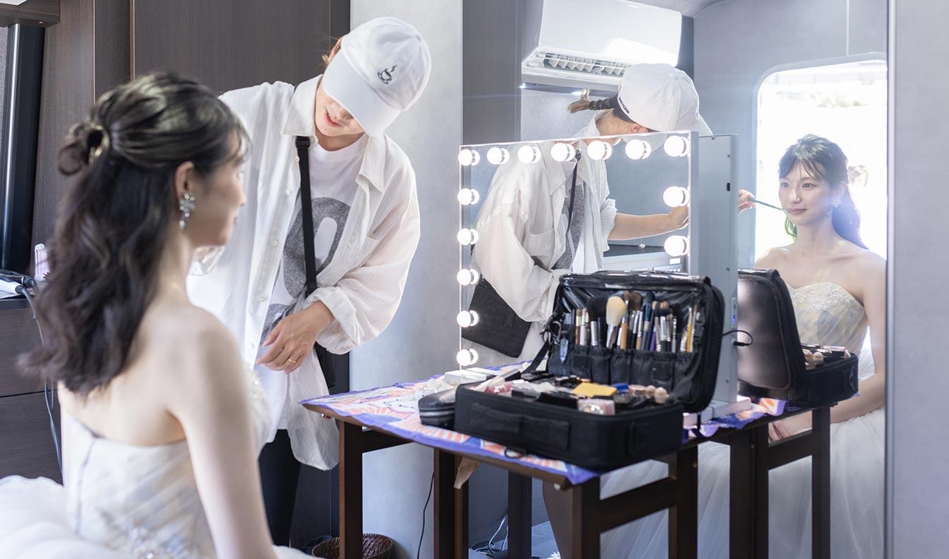 フィッティングトレーラーはおふたりだけの空間ですので、人目が気になることはありません。ゆったりと準備を整えて、撮影の合間には、ソファでリラックスしたり、音楽を聴いたりもできます。この「安心感」が緊張を和らげ、フィルター越しでもいつも通りのおふたりと会えるのです。