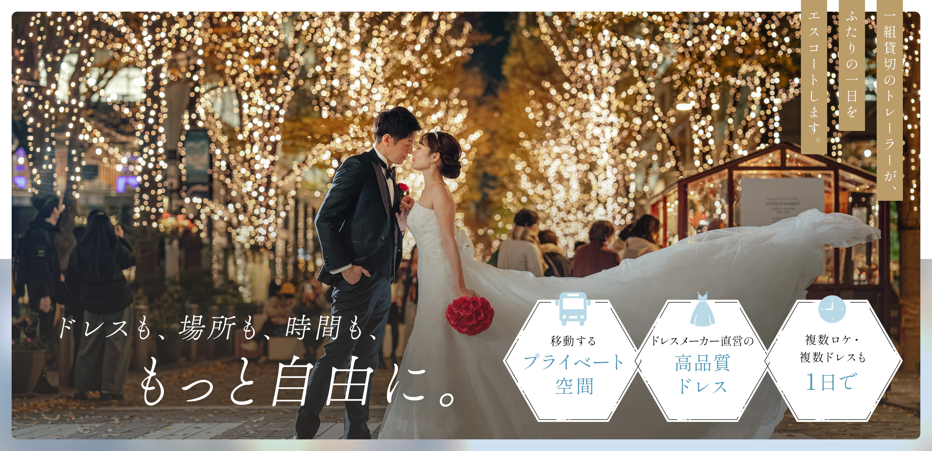 一日の間で、和装と洋装どちらも楽しむ。郊外の海辺を巡ったあとは、都心の夜景でしめる。2種類のドレスに着替えて、違う魅力を引き出す。そんなふうに、憧れを叶えてみませんか?