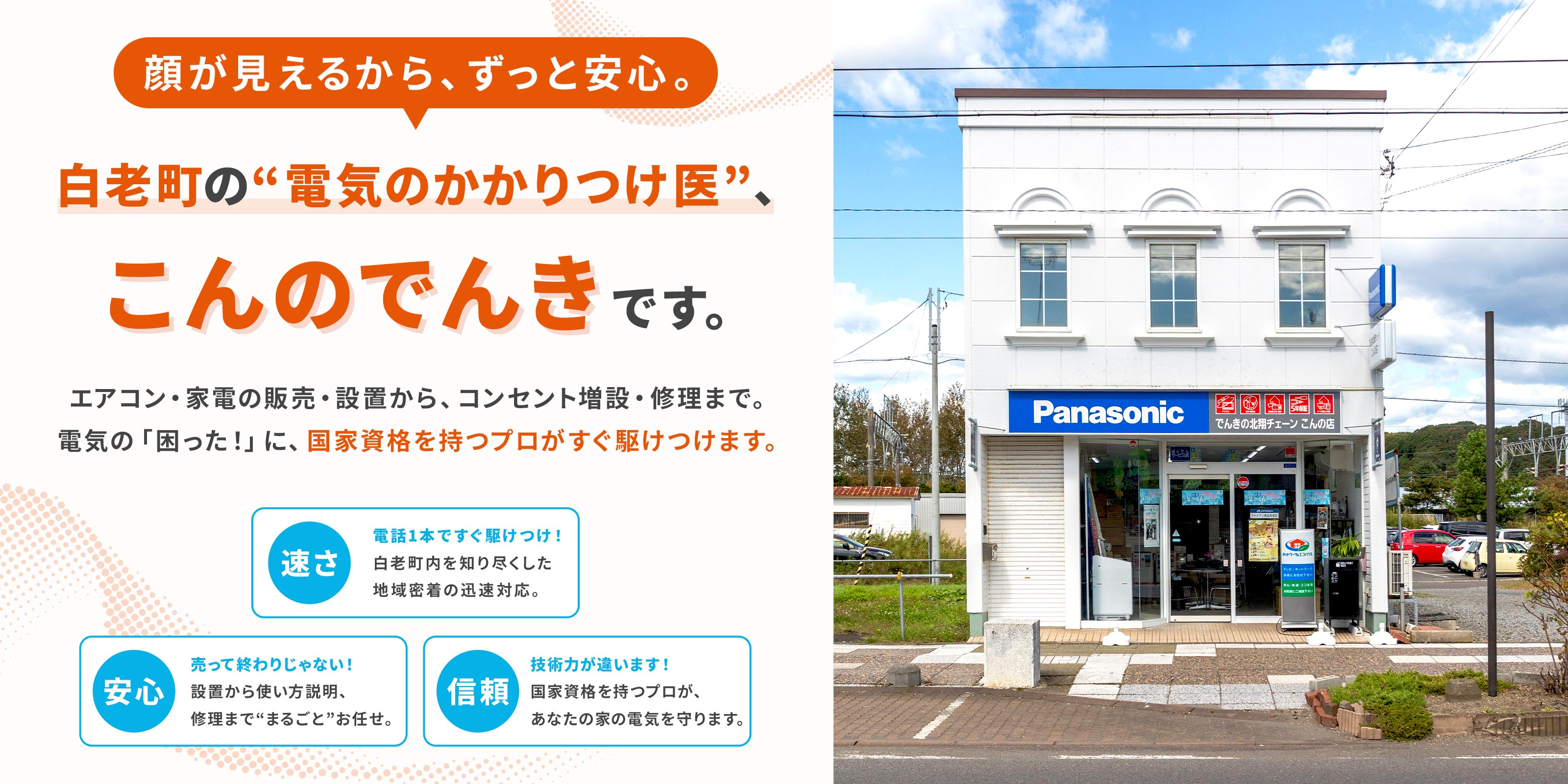 白老町で生まれ育った私にとって、地域の皆様の暮らしを守ることが使命です。「困ったら、こんのでんき」と一番に思い出してもらえる、町の“電気のかかりつけ医”であり続けます。