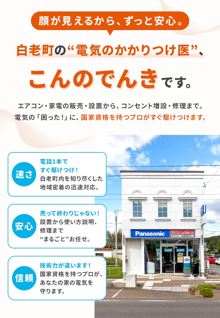 白老町大町に店舗を構える当社が、地域の皆様の暮らしを守ります。「急に動かなくなった!」そんな時は、どうぞ気軽にお電話ください。白老町を知り尽くした私だからこそ、小回りの利く迅速な対応で、お客様の「困った」を「よかった」に変えます。