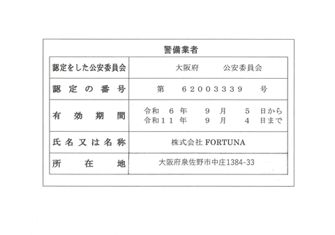 大阪府公安委員会 警備業届出受理番号:第62003339号