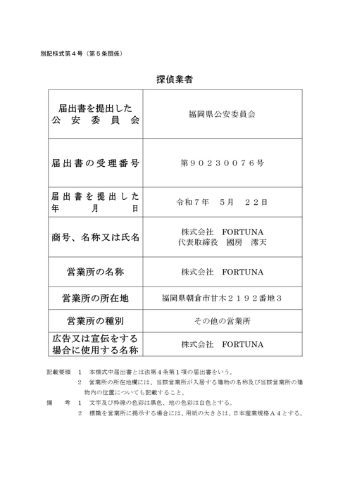 福岡県公安委員会 探偵業届出受理番号:第90230076号