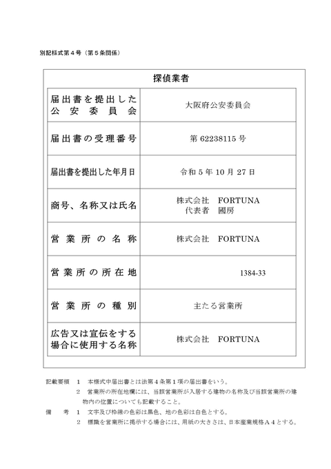 大阪府公安委員会 探偵業届出受理番号:第62238115号