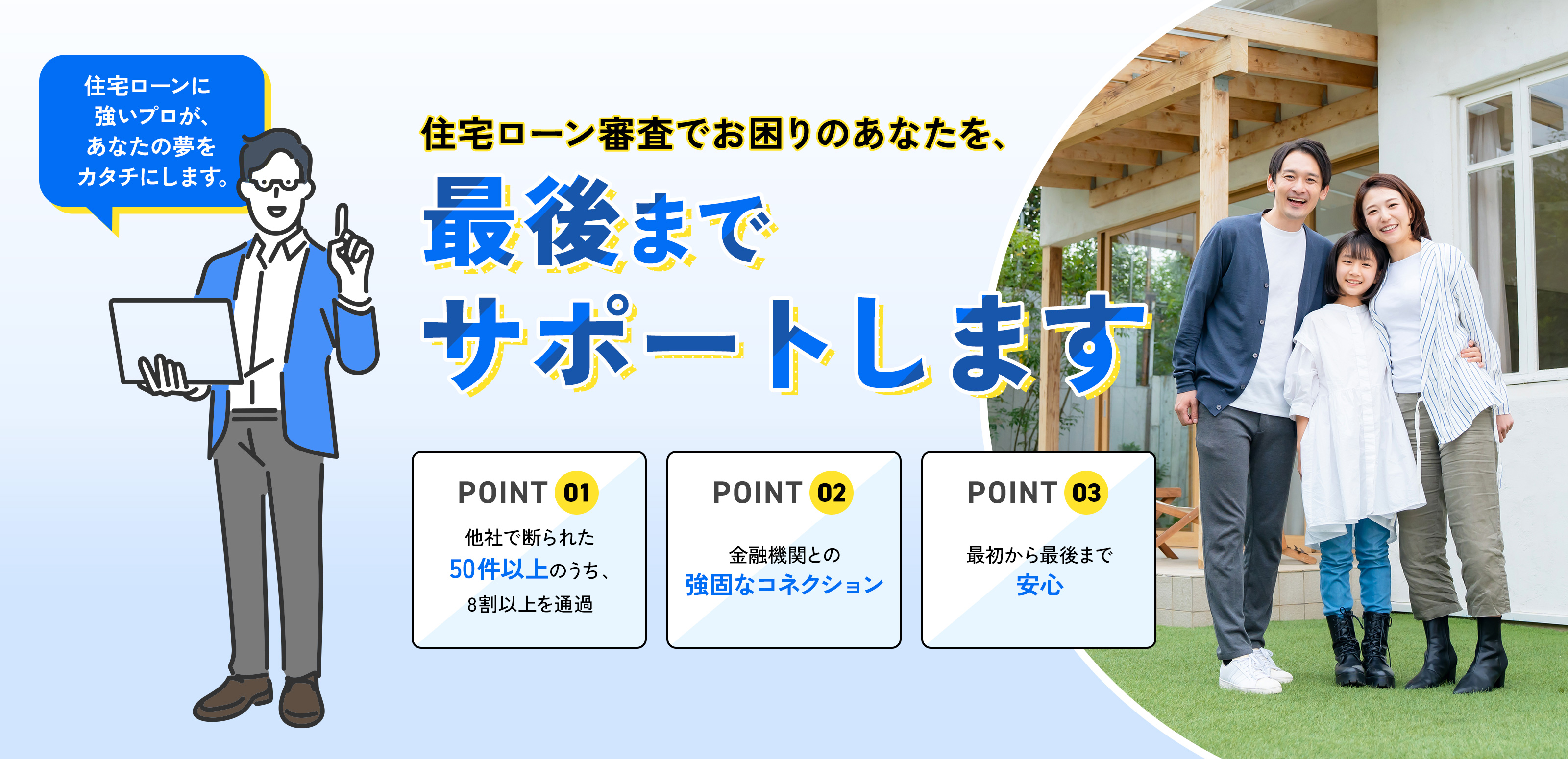 長年の経験と信頼関係により、ネットバンク、フラット35、地方銀行など、幅広い金融機関と良好な関係を築いています。