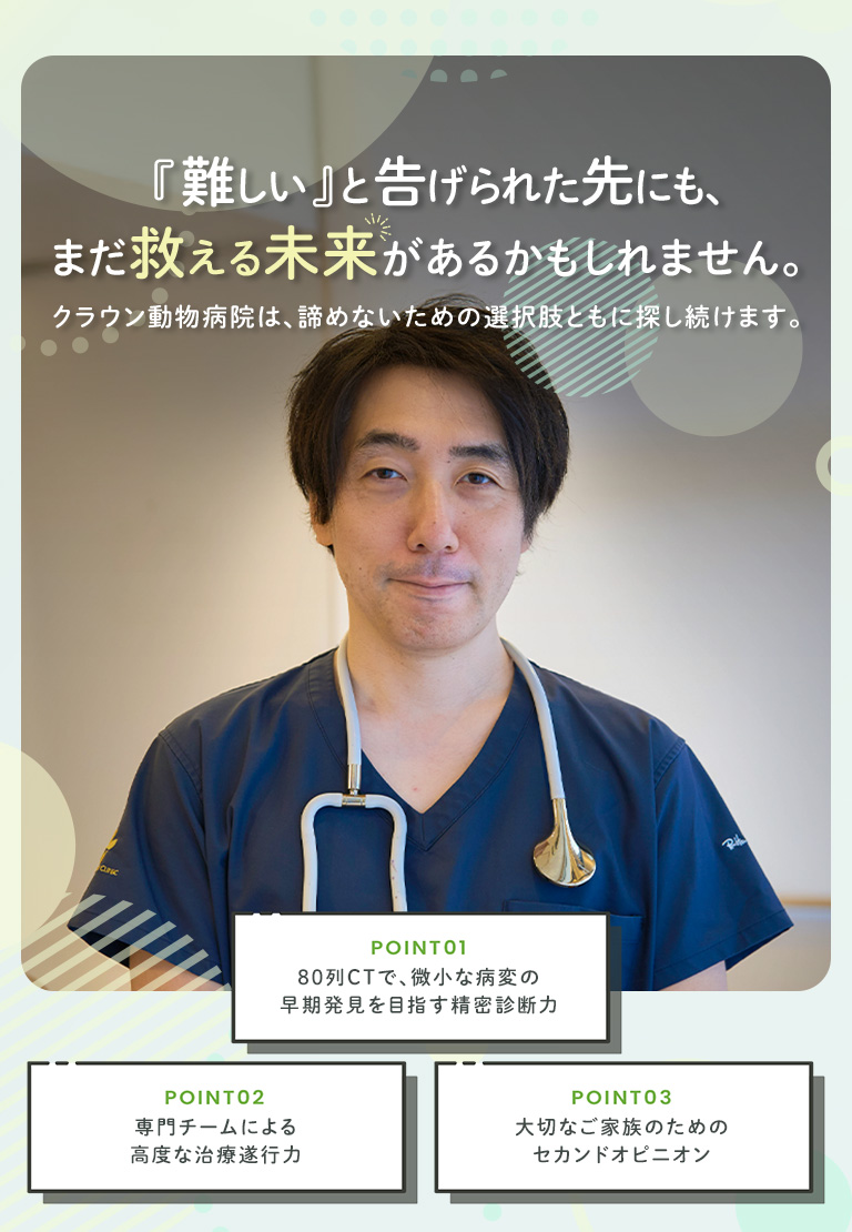 当院には、あなたと同じように、愛するご家族のことで悩み、眠れない夜を過ごした多くの飼い主様が訪れます。私たちは、その一つ一つの想いに耳を傾け、最後の最後まで可能性を追求するパートナーでありたいと願っています。