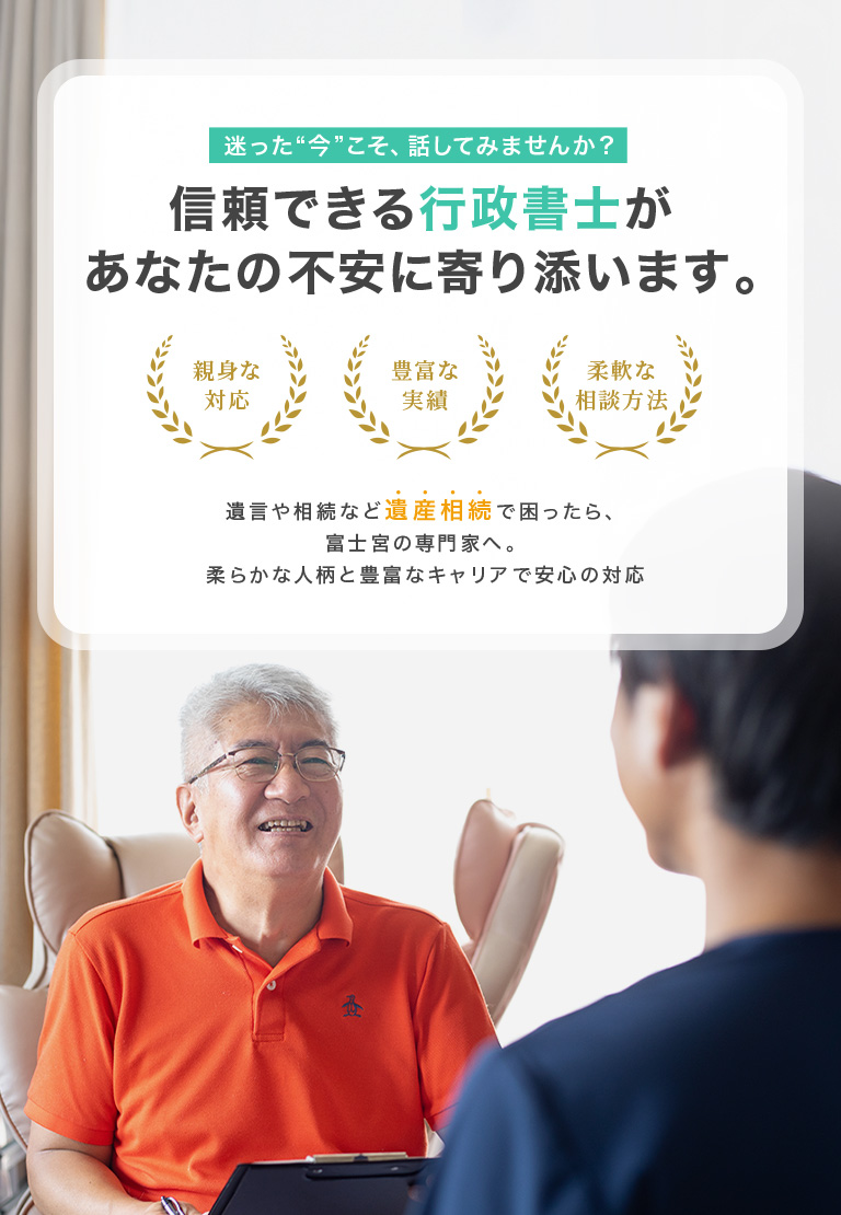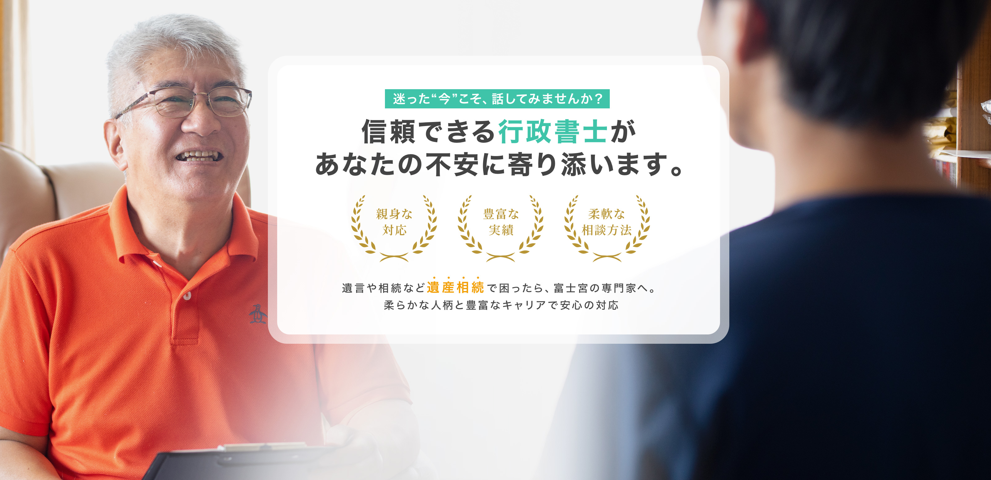 当事務所では特に相続手続き、遺言書作成に力を入れています。「これは行政書士の仕事?」と迷われた場合でも、まずはお気軽にご相談ください。