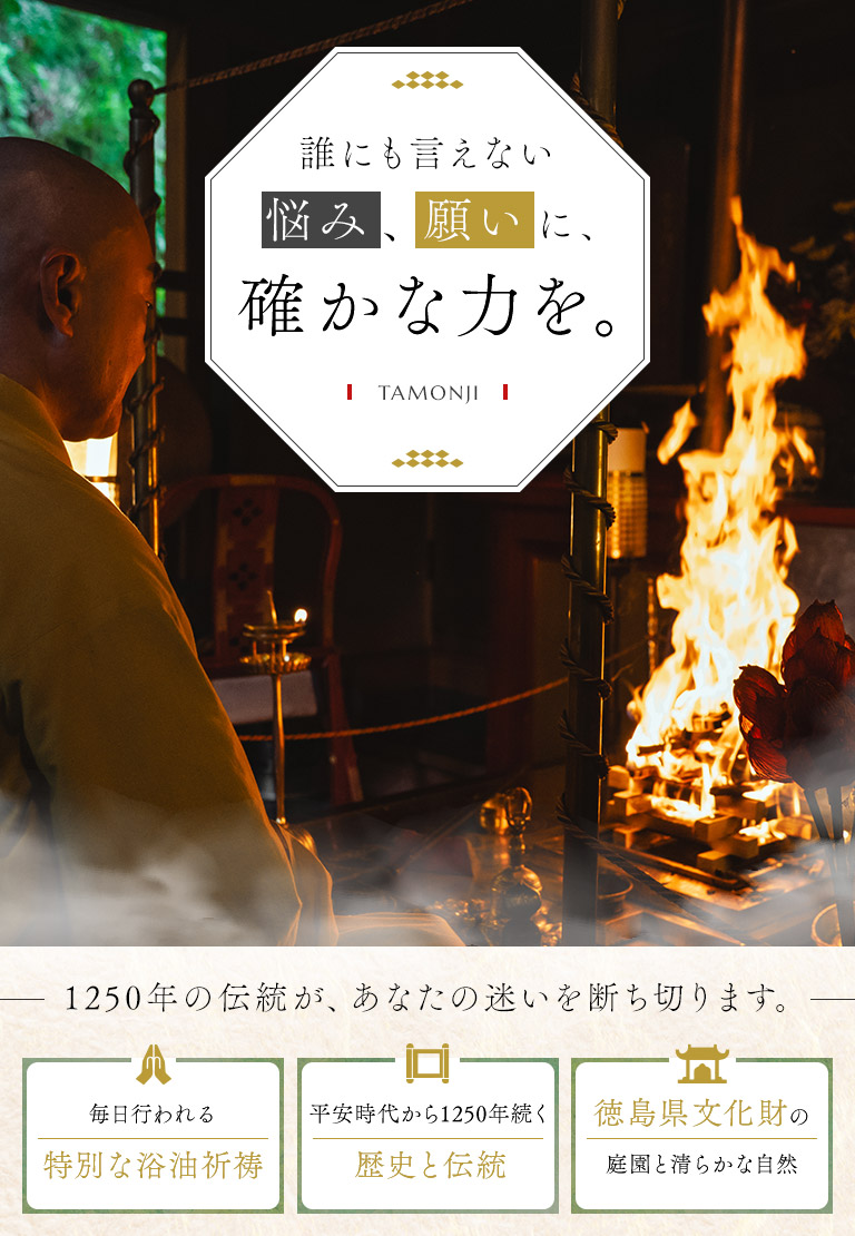 霊峰剣山より続く峰々の麓、今より千二百数十年前、若き弘法大師空海が創建したと伝わる多聞寺。本尊の毘沙門天様は、どんな事でも多くお聞きくださる「多聞天」の別名の通り、時代を超えて人々の心の拠り所であり続けました。病気平癒や商売繁昌など、様々な悩みを抱えてお参りに来られた皆様が、帰る時には心が満たされているように。『虚往実帰』の御言葉を胸に、心を込めてお迎えいたします。