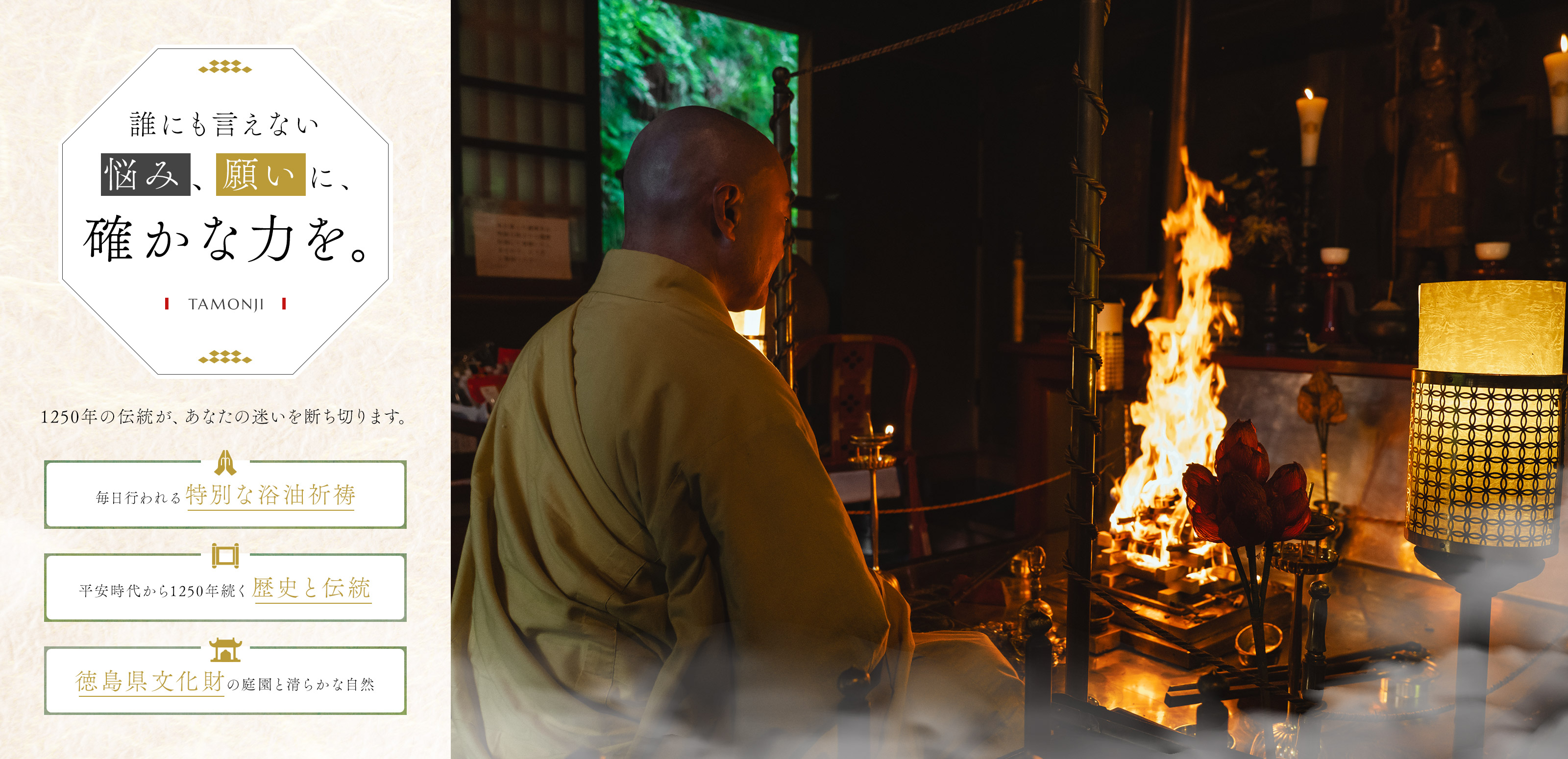 霊峰剣山の山麓にございます多聞寺は、約千二百数十年前、若き日の弘法大師空海様によって開かれたと伝わる歴史ある寺院です。私は、この真言密教の教えを後世に伝え、皆様が本尊である毘沙門天様の御利益をいただけるよう修行に努めております。