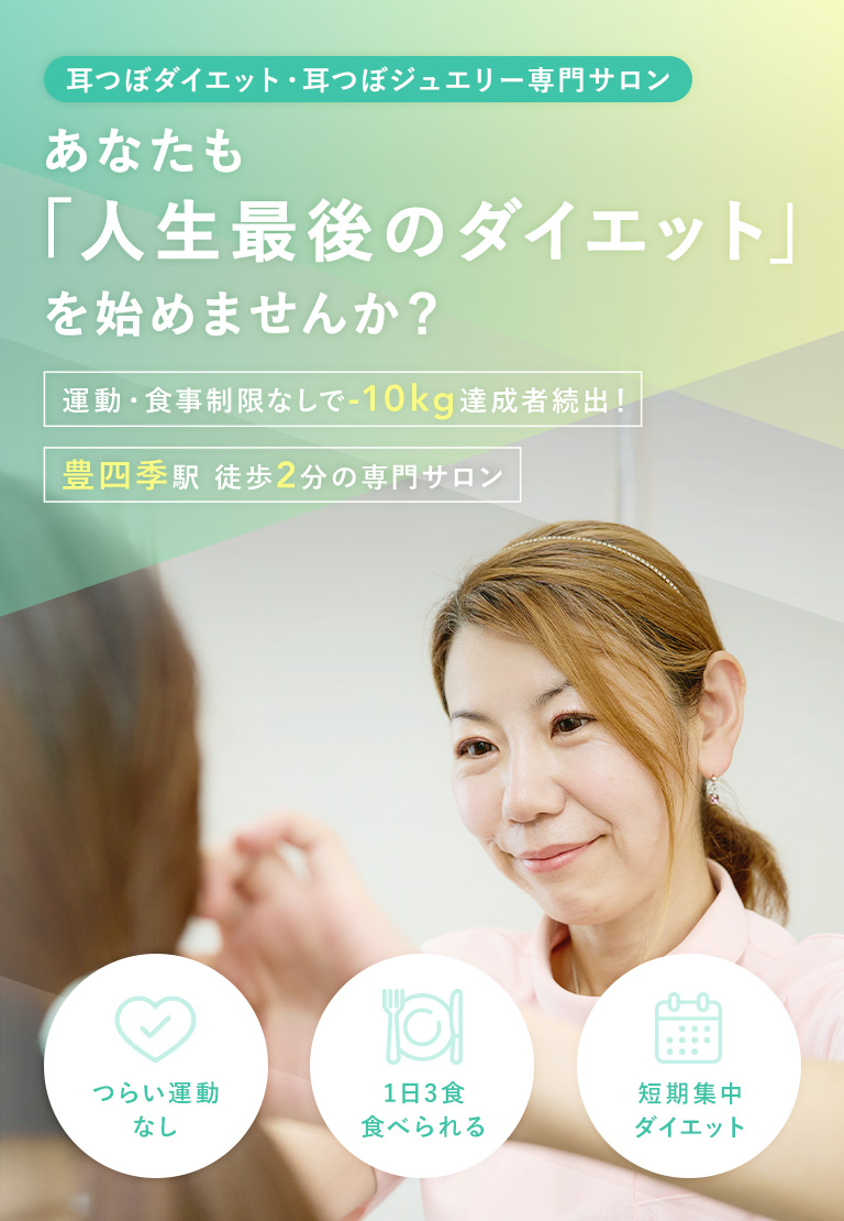 もう、「痩せない」と諦めていませんか?40代からでも遅くありません。継続的なサポートによる生活習慣の見直しで、理想の体型を目指しましょう。運動や厳しい食事制限は一切不要。耳つぼ×専門指導で、あなたの人生を変える最後のチャンスです。