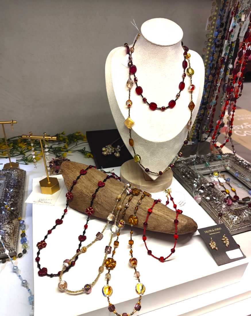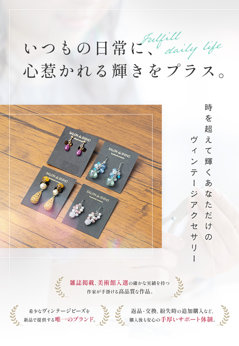 当店のアクセサリーのほとんどは、もう二度と作られることのないヴィンテージビーズを使用しており、すべて一点ものまたは限定生産品です。一度完売すると、同じデザインは二度と手に入りません。