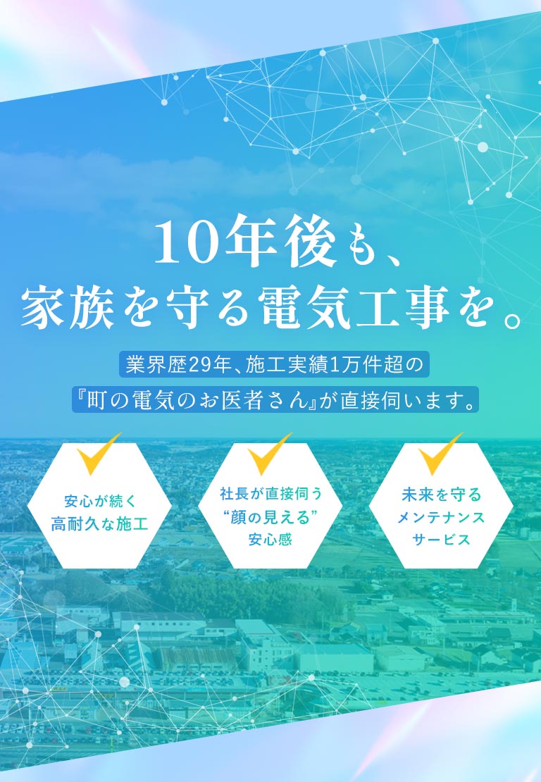 お問い合わせから施工、アフターフォローまで、すべて社長である私が責任を持って担当します。これは、お客様一人ひとりと末永くお付き合いしていきたいという強い想いからです。いつでも気軽に相談できる「町の電気のお医者さん」として、お客様の暮らしに寄り添い続けます。